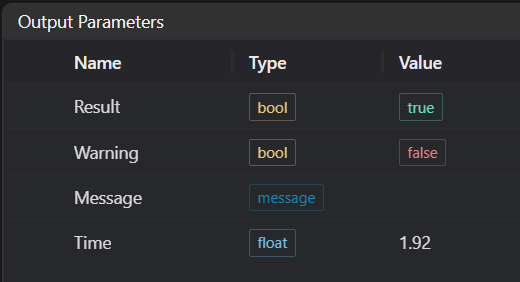 | Message | string | Output success, error, or warning messages. Empty if no error or warning. | |