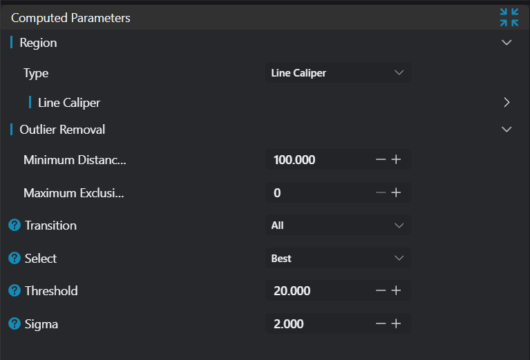 Minimum Distance Threshold0-5000100If the distance between a point on the caliper and the initially fitted line is greater than this value, delete it