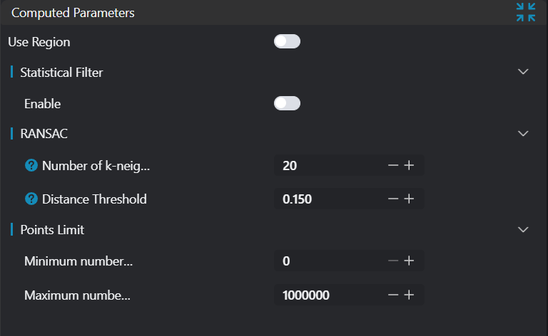 | Statistical Filter | true/false | false | Apply statistical filtering to the input point cloud | |