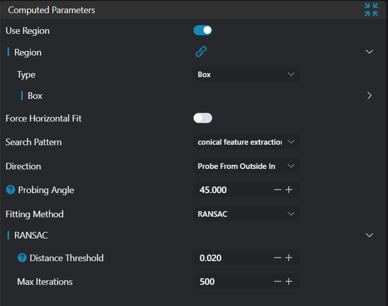 | Search Mode | Conical Point Search | Conical Point Search | Conical Point Search: Use the conical probe method to find edge points, controlling the probe angle to locate edge points in the point cloud | ![]() |