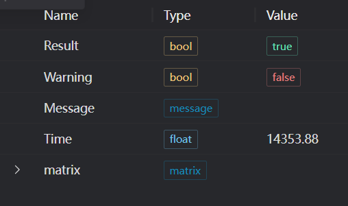 | Message | string | Output success, error, or warning messages. Empty if no error or warning. | |