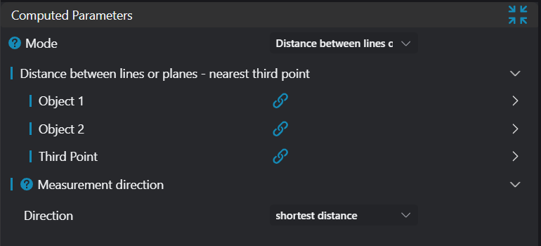 • Distance Between Skew Lines/Planes (Reference Point Outside Line/Plane): Select function to measure distance between line and line, line and plane, plane and plane using a third point