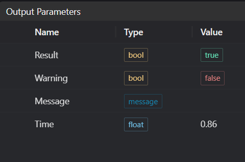 | Message | string | Outputs success, error, or warning information; if there is no error or warning, it is empty | |