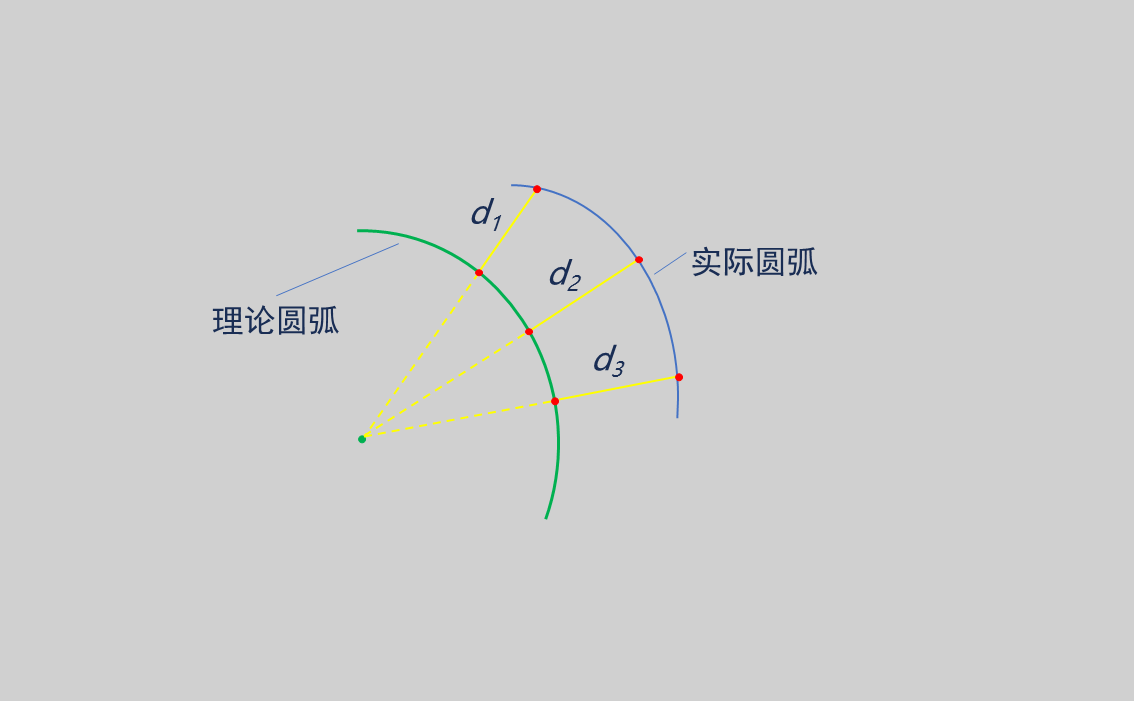如下图所示,对理论圆弧点和理论圆圆心连线,取其反向延长线与实际圆弧的交点,计算交点到对应理论圆弧点的距离,记为𝑑1, 𝑑2, …, 𝑑n,则线轮廓度为: