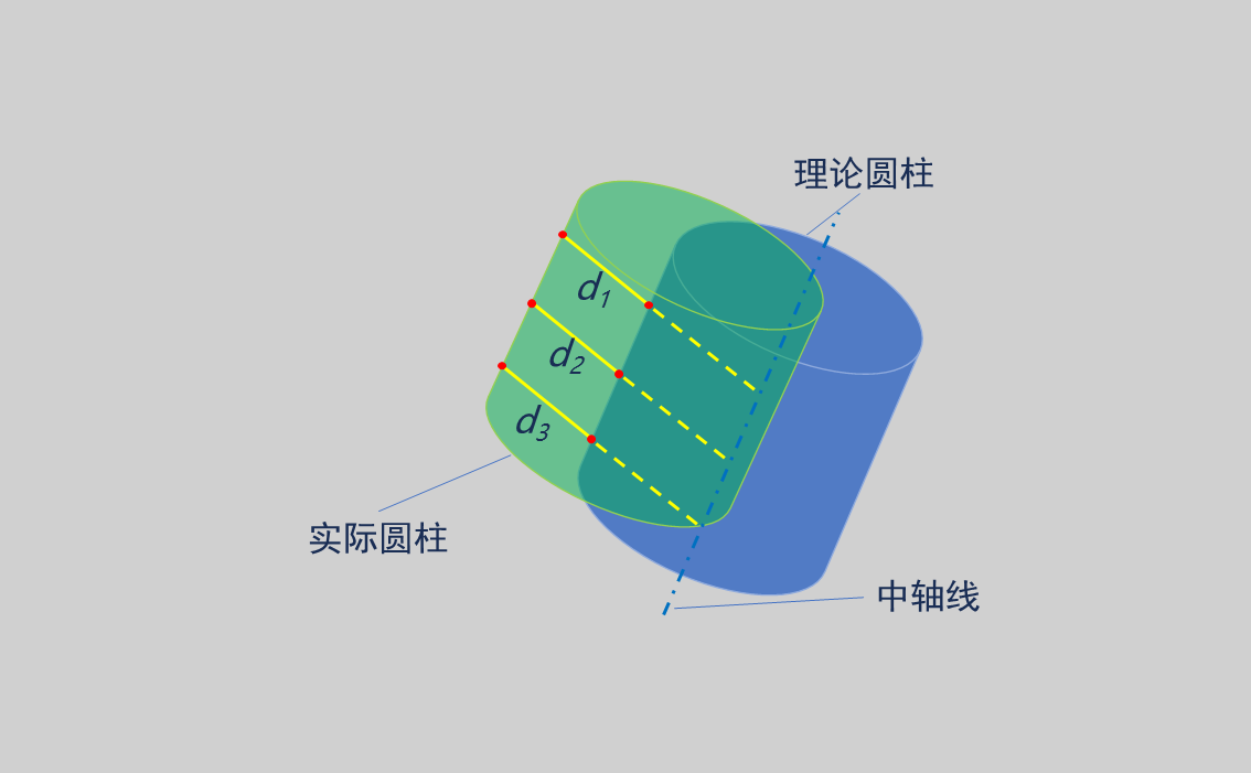 如下图所示,对输入理论圆柱点,连接其与轴线的垂足,计算反向延长线与实际圆柱的交点,取该交点到对应理论圆柱点的距离为𝑑1、𝑑2、…、𝑑n,则其面轮廓度为: